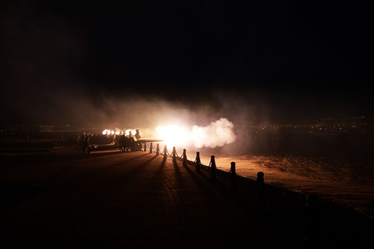 Праздничные салюты запускали с берега Невы у стен Петропавловской крепости. Горожане и гости города наблюдали за красочным небом с мостов и набережных.