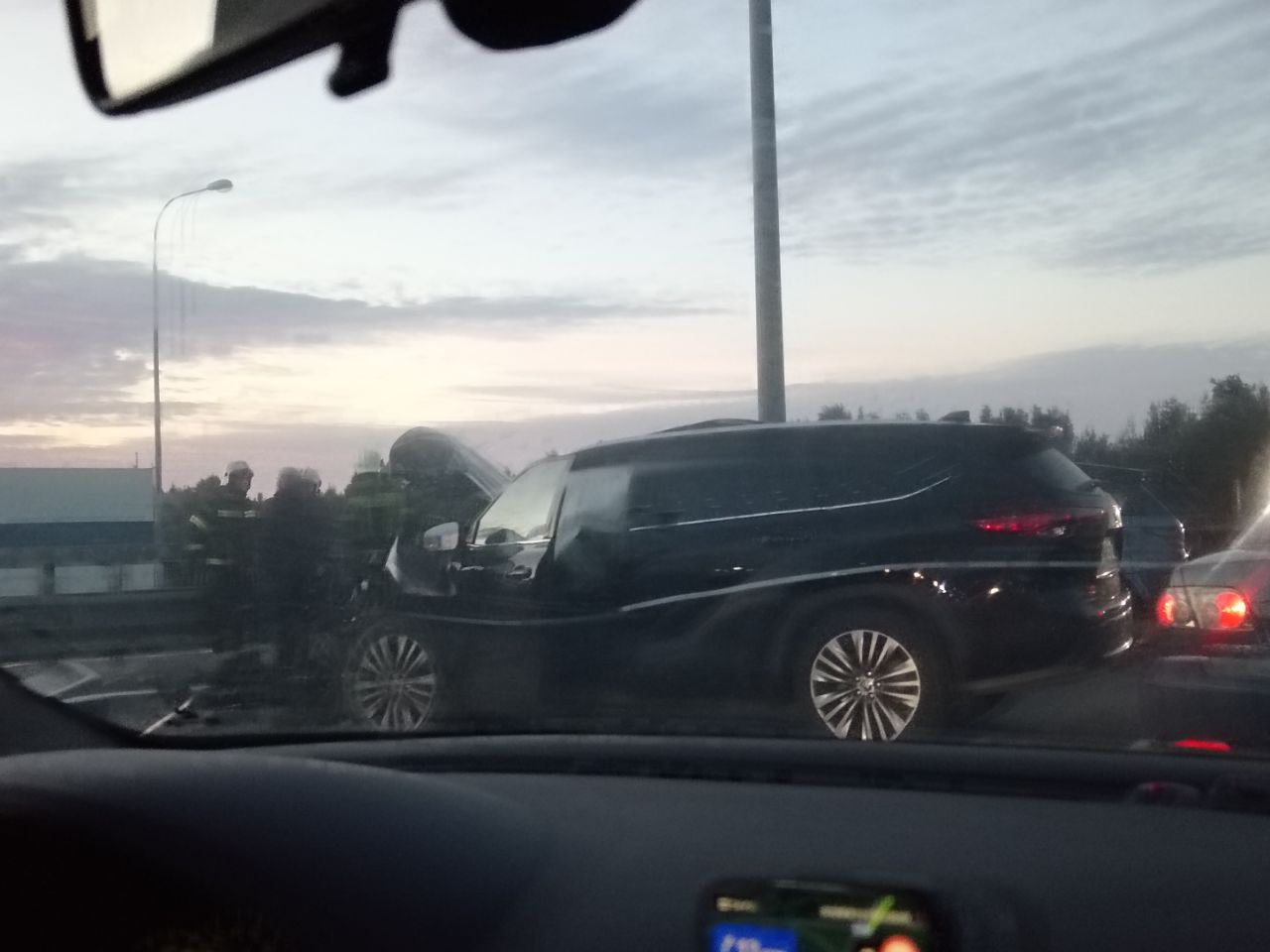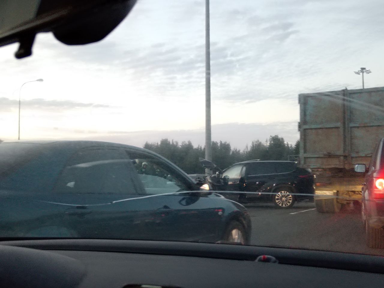 Читатель Мойки78 Дмитрий прислал в редакцию снимки с места ДТП, которое произошло на внутреннем кольце КАД у съезда на Выборгское шоссе. В левой полосе кольцевой автодороги столкнулись два кроссовера.