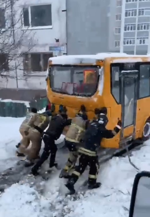 На кадрах от МЧС России видно, что на заснеженных дорогах застряли два автобуса. Первый толкали, второй тянули тросом.